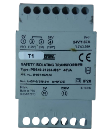 Noratel PDS40-21224-M3P Safety Isolating TransformerTechnical Specifications: Model: PDS40-21224-M3P Phases: Single-phase (1) Frequency Range: 47 - 63 Hz Primary Voltage: 230 V Secondary Voltage Options: 12 V / 3.33 A 24 V / 1.66 A Power Output: 40 VA Protection Rating: IP20 Dimensions and Weight:...