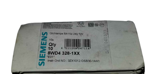 Siemens 8WD43281XX Incandescent Bulb10x Siemens 8WD43281XX Incandescent Bulb Incandescent lamp, 24 V AC/DC, 5 W, Base BA 15d, accessory for signaling columns, with diameters 50 mm + 70 mm, (Packing unit 10 units)Brand: Siemens MPN: 8WD43281XXSpecific: Volts: 24Specific: Watts: 5 Price here is...